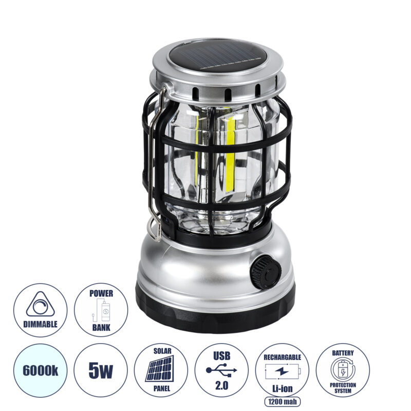 GloboStar® 69932 Αυτόνομο Ηλιακό Επαναφορτιζόμενο Φανάρι Camping LED 5W με Επαναφορτιζόμενη Μπαταρία 18650 1200mAh Li-ion – Power Bank – Αδιάβροχο IP54 – Dimmable – Μαύρο Ασημί – Ψυχρό Λευκό 6000K Φ10.2 x Υ16cm