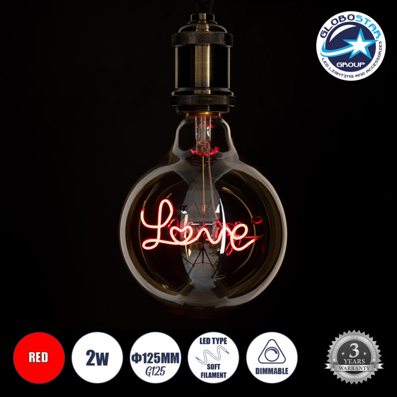 GloboStar® 99253 Λάμπα LED Ultra Thin Soft S Spiral Letter Filament E27 G125 LOVE Γλόμπος 2.4W 204lm 360° AC 220-240V IP20 Φ12.5 x Υ18cm Κόκκινο με Μελί Γυαλί – Dimmable – 3 Years Warranty