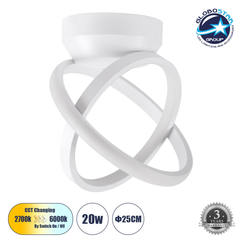 GloboStar® AMELIA 61053 Φωτιστικό Οροφής Design LED CCT 20W 2400lm 300° AC 220-240V – Εναλλαγή Φωτισμού μέσω Διακόπτη On/Off All In One Ψυχρό 6000k+Φυσικό 4500k+Θερμό 2700k Μ24.5 x Π16 x Υ25cm – Λευκό
