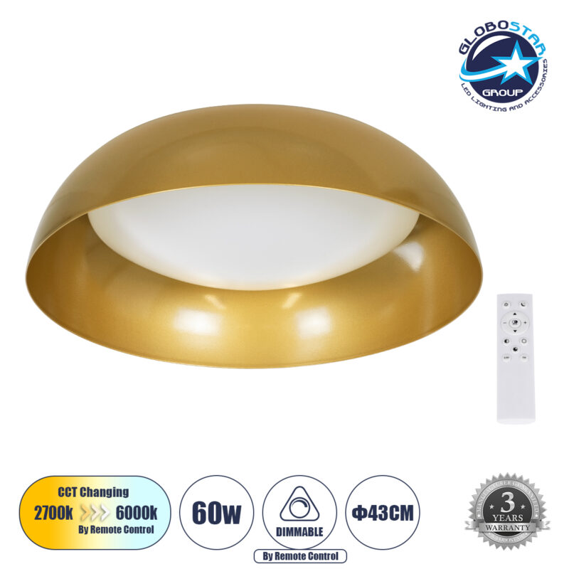 GloboStar® ANATOLIA 61263 Πλαφονιέρα Οροφής LED CCT 60W 6900lm 120° AC 220-240V – Εναλλαγή Φωτισμού μέσω Τηλεχειριστηρίου All In One Ψυχρό 6000k+Φυσικό 4500k+Θερμό 2700k Dimmable Φ43cm – Χρυσό – 3 Years Warranty