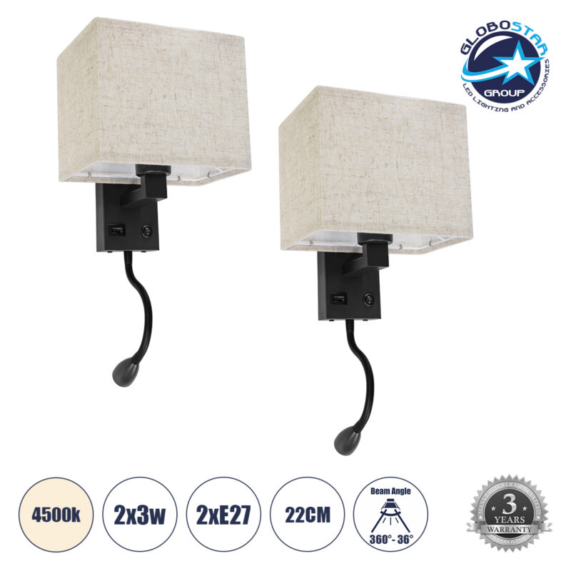 GloboStar® ROULETTE-S 61382 Μοντέρνο Φωτιστικό Τοίχου – Απλίκα Ξενοδοχείου Bed Side LED 3W 360lm & 1 x E27 36° & 360° AC 220-240V – Reading Up/Down Light – Φορτιστής USB 3A – Μ17 x Π20 x Υ37cm – Φυσικό Λευκό 4500K – Μαύρο με Μπεζ Καπέλο – Σετ 2 Τεμαχίων