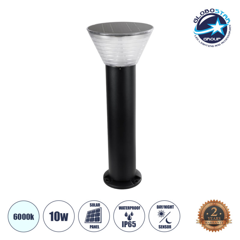 GloboStar® VEGGIE 90525 Αυτόνομο Ηλιακό Φωτιστικό Κήπου – Κολωνάκι Αρχιτεκτονικού Φωτισμού Εξωτερικού Χώρου LED 10W 330lm 120° με Ενσωματωμένο Φωτοβολταϊκό Panel 6V 2W & Επαναφορτιζόμενη Μπαταρία Li-ion 3.2V 1800mAh με Αισθητήρα Ημέρας-Νύχτας – Αδιάβροχο IP65 – Σώμα Αλουμινίου & ABS – Φ23 x Υ60cm – Ψυχρό Λευκό 6000K – Μαύρο – 2 Χρόνια Εγγύηση