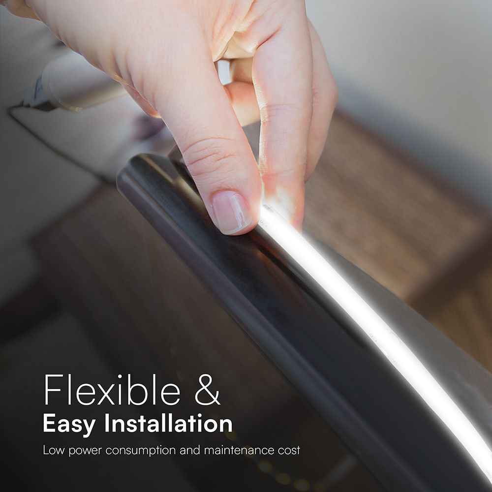 Η τεχνολογία COB (Chip On Board) εξασφαλίζει υψηλή πυκνότητα LED, άριστη ομοιομορφία και καλύτερη θερμική συμπεριφορά σε σχέση με τα κλασικά SMD strips. Το strip λειτουργεί στα 24V, προσφέροντας μεγαλύτερη σταθερότητα, λιγότερη πτώση τάσης και μεγαλύτερη διάρκεια ζωής.