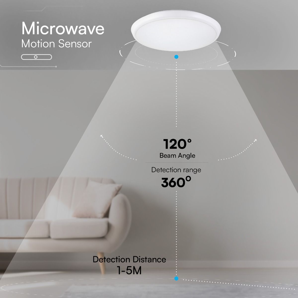 Η τεχνολογία 5‑in‑1 επιτρέπει επιλογή τόσο CCT (2700K–6500K) όσο και ισχύος (20W–40W) μέσω ενσωματωμένου διακόπτη, προσφέροντας απόλυτη ευελιξία σε κάθε εφαρμογή. Ο microwave sensor λειτουργεί με υψηλή ακρίβεια, ανιχνεύοντας κίνηση ακόμη και πίσω από εμπόδια, με 360° κάλυψη και ρυθμιζόμενες παραμέτρους (χρόνος, απόσταση, φωτεινότητα περιβάλλοντος).