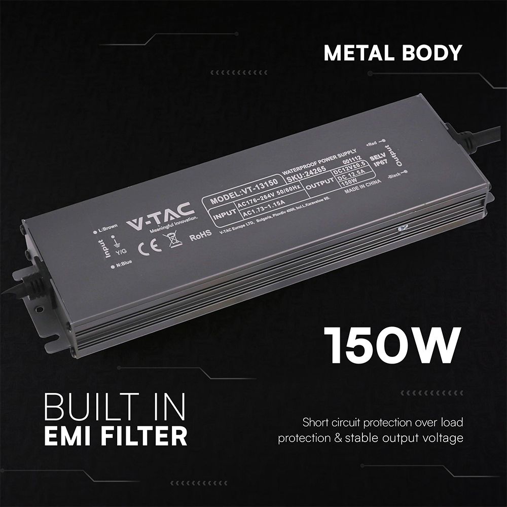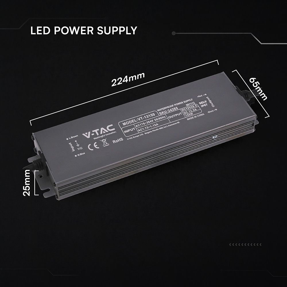 Το V‑TAC 24265VT είναι ένα αδιάβροχο τροφοδοτικό LED 12V, 150W, με προστασία IP67, μεταλλικό σώμα και ενσωματωμένες προστασίες υπέρτασης και βραχυκυκλώματος. Ιδανικό για εξωτερικές εγκαταστάσεις, ταινίες LED και απαιτητικές επαγγελματικές εφαρμογές.