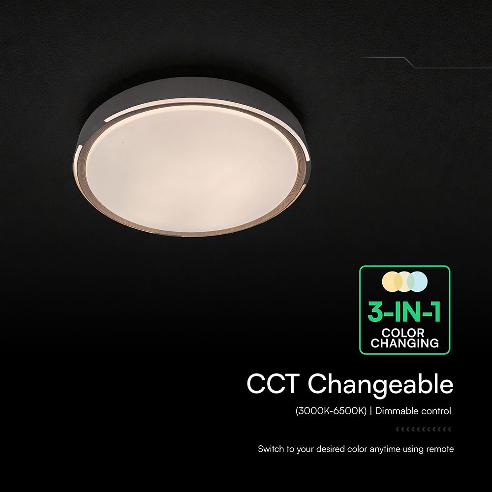 Μοντέρνα LED πλαφονιέρα οροφής V-TAC VT-85034 με 60 W ολικής ισχύος, 3-in-1 ρύθμιση χρώματος φωτός (3000/4000/6500 K) και τηλεχειριστήριο με dimmer, σε ξύλινη decorative επικάλυψη — ιδανική για σαλόνι, τραπεζαρία, υπνοδωμάτιο και κοινόχρηστους χώρους, με 2 χρόνια εγγύηση κατασκευαστή.